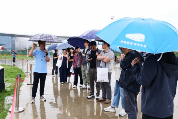 在长安校区军工素质教育实践中心(飞机展示区),员工们冒雨参观航空航天装备展示。雨点浇不灭热情,大家纷纷用手机记录,聆听讲解员讲述装备背后西工大人的贡献,不时发出赞叹。