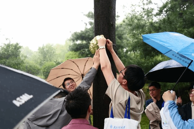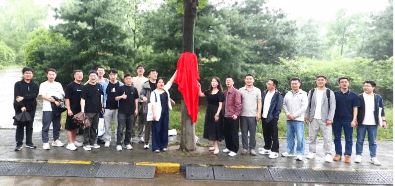 下午,雨仍在下,理公司大楼前举行了简朴庄重的捐赠仪式。当牌匾悬挂在楼前大树上时,雨水顺着牌面流淌,仿佛岁月的印记在此定格。员工们冒雨见证这一时刻,裤脚虽被溅湿,却浇不灭对母校的拳拳之心。