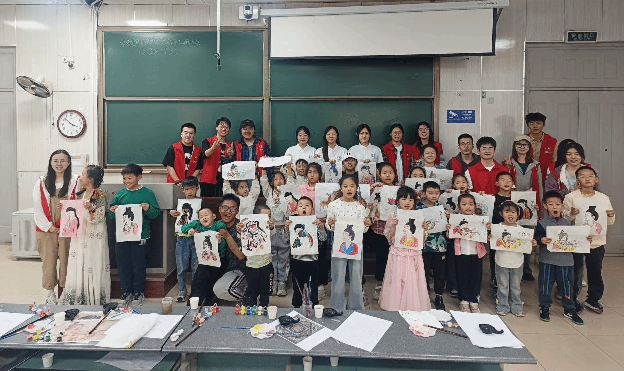 通过壁画社同学们的现场讲解,孩子们沉浸在唐代壁画的艺术魅力中,仿佛时光倒流,置身于千年前的繁华盛世;通过互动体验式的学习,孩子们亦感受到了唐代壁画所蕴含的历史、文化和艺术之美,他们迫不及待地拿起画笔,将心中所想、所感融入自己的壁画创作中。在这个充满活力和创意的氛围中,孩子们的壁画逐渐展现出生动的画面和丰富的内涵,他们用色彩和线条勾勒出的壁画充满了童真童趣,散发出青春的气息和无限的可能性,同时也蕴含着对中华传统文化的热爱和敬意。