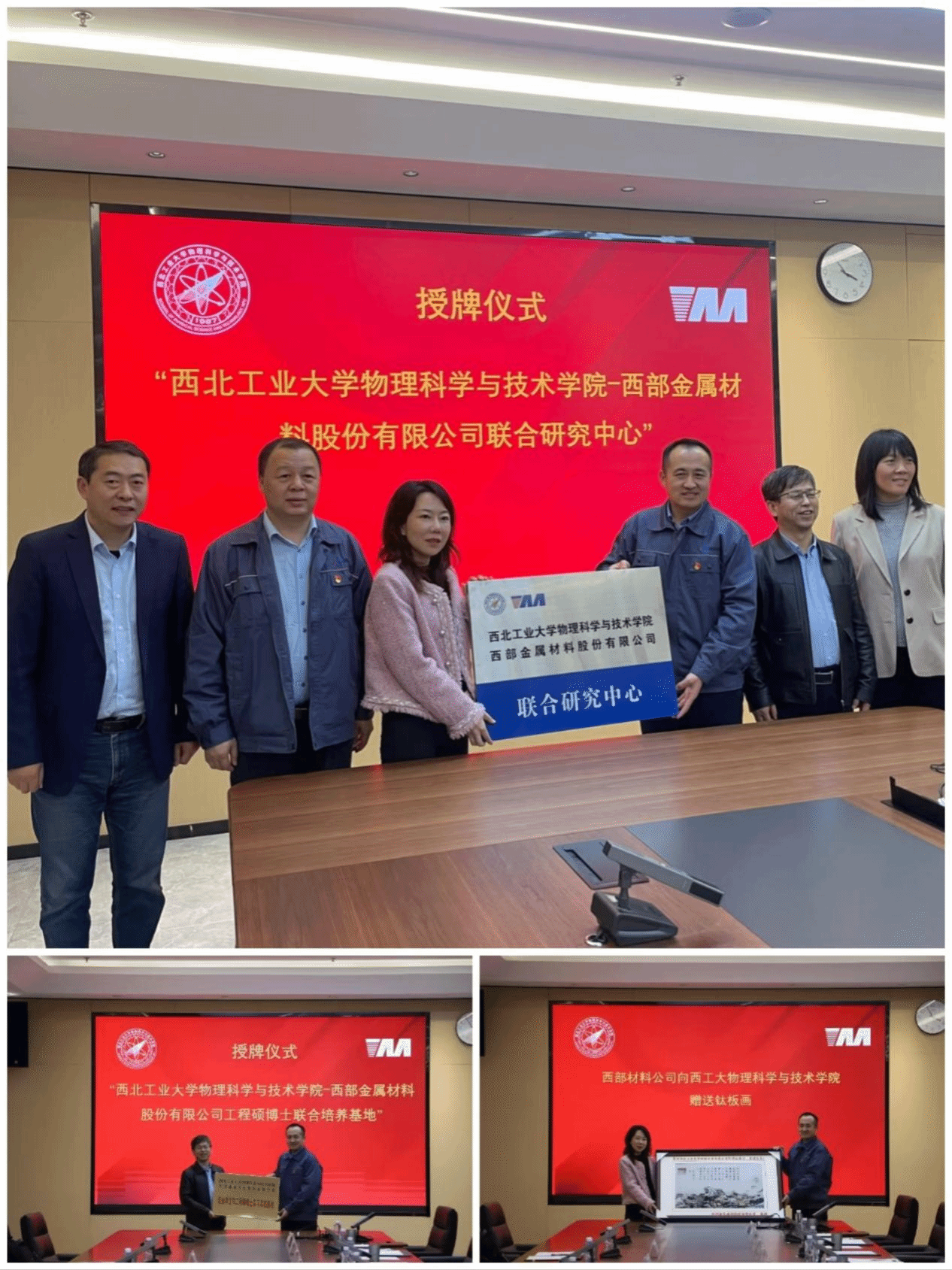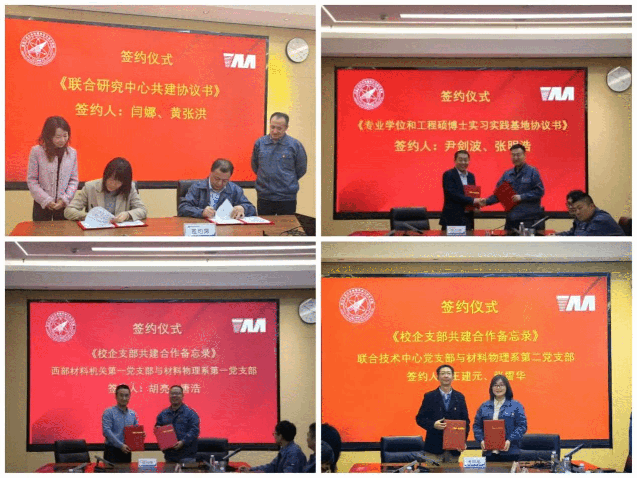 双方签署了《世界杯官方网站入口2026—西部金属材料股份有限公司联合研究中心共建协议》、《世界杯官方网站入口2026-西部金属材料股份有限公司专业学位和工程硕博士实习实践基地协议书》、《世界杯官方网站入口2026-西部金属材料股份有限公司工程硕博士联合培养(实践)协议书》、《校企支部共建合作备忘录》,同时还举行了联合研究中心、工程硕博士联合培养基地、专业学位和工程硕博士实习实践基地的授牌仪式。
