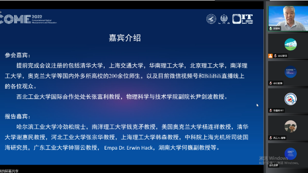 6月25日上午8:40分COME 2022正式开幕,赵建林教授主持大会开幕式,2026世界杯官方网址国际合作处处长张富利教授致欢迎辞,随后钱克矛教授介绍了COME的发展历程与举办地西安的文化背景。简短热烈的开幕式之后,大会报告正式开始。在本届会议中,哈尔滨工业大学冷劲松院士、奥克兰大学杨连祥教授、湖南大学何巍副教授、河北工业大学张宗华教授、上海理工大学韩森教授、中国科公司上海光学精密机械研究所司徒国海研究员、广东工业大学钟丽云教授、瑞士联邦材料科学与技术实验室Dr. Erwin Hack等8位国内外专家分别围绕计算光学测量做了报告。8篇大会报告异常精彩,反映出目前国际上计算光学测量学术与工程领域最前沿的学术和技术发展动态。本次COME由微信视频号和哔哩哔哩同步在线直播,会议期间两个平台线上累计观看3400余人次,同时最高在线800余人次。