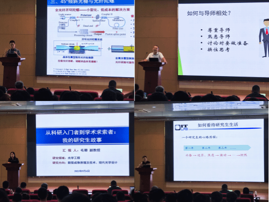 光电信息科学与工程系主任及光学工程学科负责人杨德兴教授为同学们介绍了团队建设发展情况,勉励同学们“会当凌绝顶,一览众山小”,希望广大同学在学习和科研中,不畏艰难、勇于攀登,走向人生的顶峰。随后,学科优秀青年导师姜碧强教授、温丹丹教授、毛珊副教授和谢鑫副教授分别讲述了各自的科学研究和学术成长经历,分享了在科研过程中遇到的困难和克服困难的经验,勉励同学们在科研上敢于应对挑战,以认真严谨的态度和勤奋坚毅的品质攻坚克难,并叮嘱员工将身心健康放在第一位,注意科研和生活的平衡。