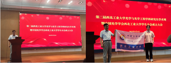 中国光学学会会士赵建林教授随后向同学们介绍了中国光学学会设立员工分会的意义,鼓励同学们通过学会和员工分会提供的平台,积极参加学术交流活动,相互学习、共同进步。随后,赵建林教授和员工分会主席毕辛仪共同向大家展示了中国光学学会授给公司员工分会的会旗。