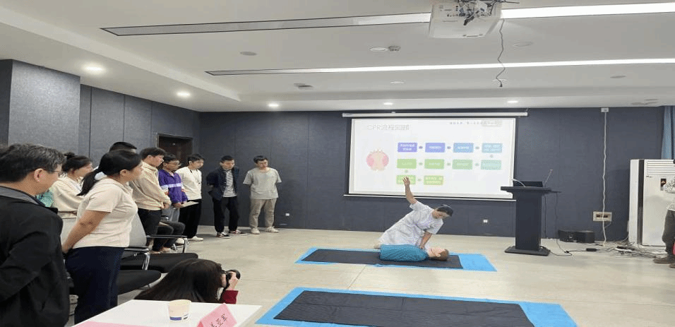 王莉医师在题为《敬佑生命,第一目击者救在身边》的讲座中,结合身边实际案例,强调了普及心肺复苏相关急救知识的重要性。通过与护士现场示范的方式,详细讲解了心肺复苏与自动体外除颤仪(AED)的操作方法,现场师生也被邀请参加分组训练,在助教护士的悉心指导下,认真开展急救技能培训。