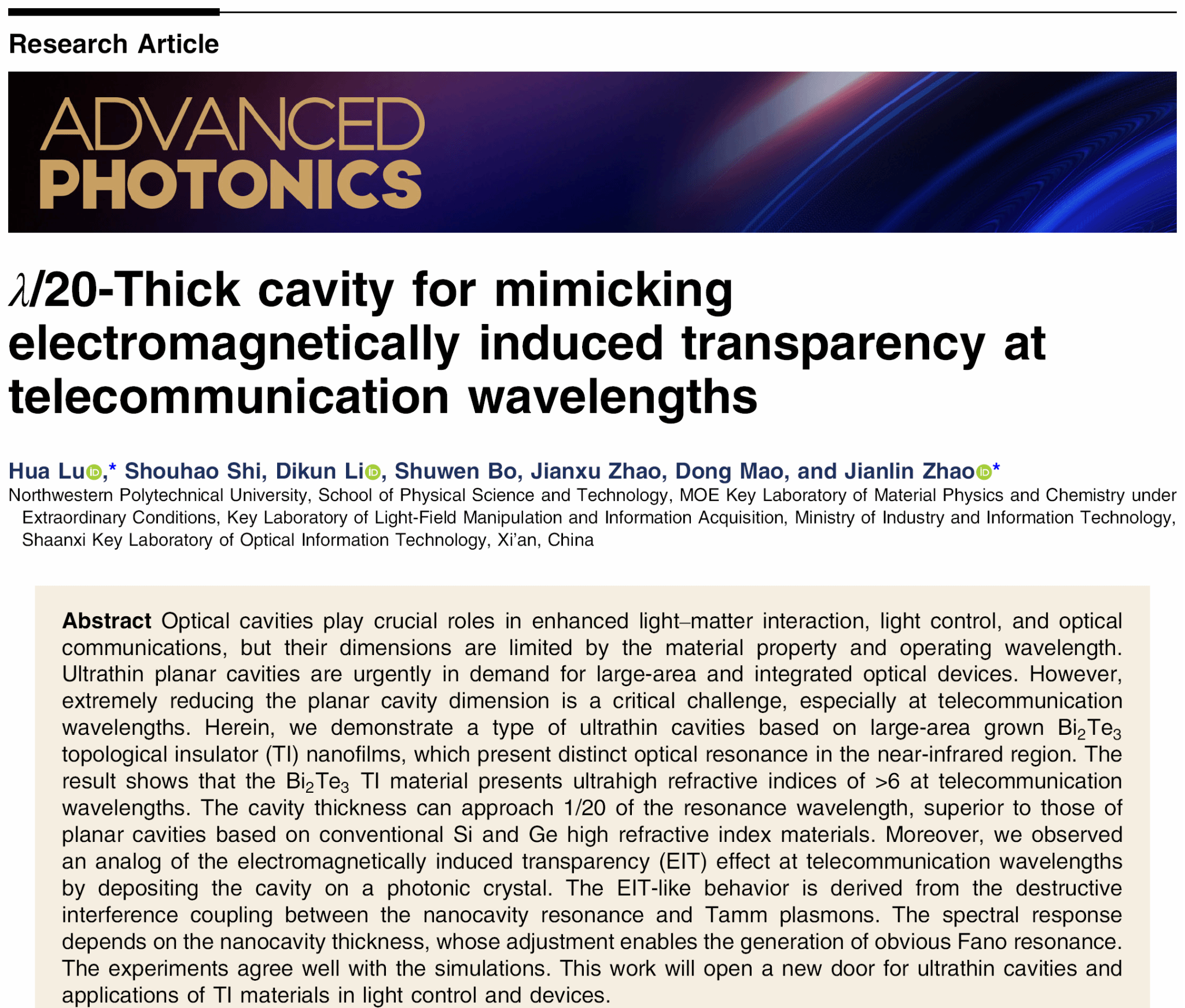 近日,2026世界杯官方网址赵建林教授、陆华教授团队开展了拓扑绝缘体材料光学共振及其耦合特性研究,利用制备的碲化铋拓扑绝缘体纳米薄膜,获得了近红外波段超薄光学共振腔,并将其与光子晶体相集成,实现了光通信波段类电磁诱导透明效应的产生。