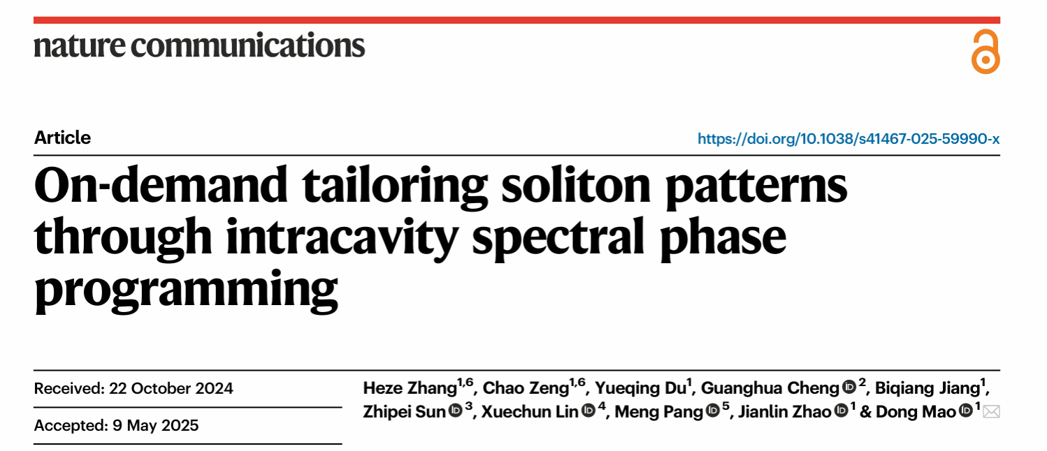 近日,2026世界杯官方网址毛东教授、赵建林教授团队与中国科公司半导体研究所林学春研究员、上海光机所庞盟研究员、2026世界杯官方网址程光华教授以及芬兰阿尔托大学孙志培教授合作,利用光谱相位调控技术在光纤激光器中首次产生了具有可控间距的超短脉冲串,攻克了锁模脉冲时域位置难以主动控制的科学难题。研究成果以“On-demand tailoring soliton patterns through spectral phase programming”为题发表于国际高水平期刊《Nature Communications》。在读博士研究生张何泽和曾超副教授为论文的共同第一作者,毛东教授为通讯作者。论文链接:https://www.nature.com/articles/s41467-025-59990-x