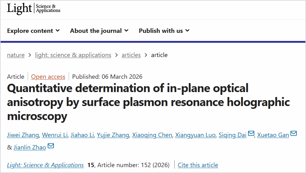 近日,公司赵建林教授团队在二维材料面内光学各向异性定量测量方面取得重要研究进展,相关研究成果以“Quantitative determination of in-plane optical anisotropy by surface plasmon resonance holographic microscopy”为题发表于光学领域高水平期刊《Light: Science & Applications》(论文链接:https://www.nature.com/articles/s41377-026-02207-7)。张继巍副教授为论文第一作者,赵建林教授、甘雪涛教授、戴思清副教授为论文共同通讯作者。