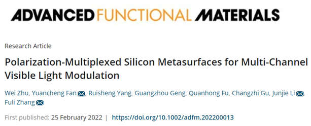 相关成果以“Polarization-Multiplexed Silicon Metasurfaces for Multi-Channel Visible Light Modulation”为题发表于高影响力学术期刊《Advanced Functional Materials》(DOI: 10.1002/adfm.202200013; IF:18.808)。西工大世界杯官方网站入口2026朱维博士为论文第一作者,樊元成教授、张富利教授和中国科公司物理研究所李俊杰研究员为共同通信作者。