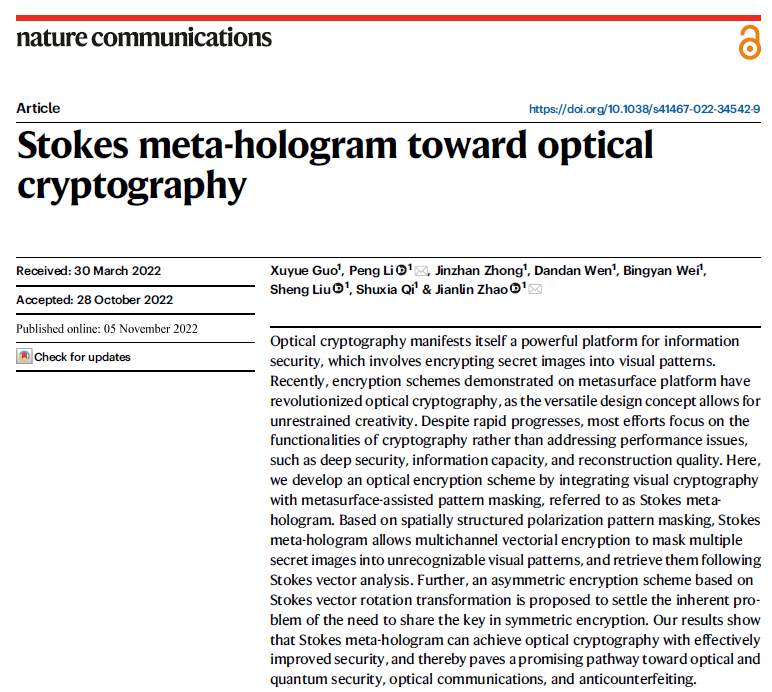 近日,国际顶级期刊Nature Communication(《自然·通讯》)以“Stokes meta-hologram toward optical cryptography”(DOI:10.1038/s41467-022-34542-9)为标题在线发表了世界杯官方网站入口2026李鹏教授、赵建林教授研究团队在光场调控研究方面所取得的突破。该工作发展了一种全新的用于光学加密的斯托克斯矢量编码超表面全息图,并系统地给出了采用该器件进行不同层级偏振掩蔽的光学加密方案。全文链接:https://www.nature.com/articles/s41467-022-34542-9