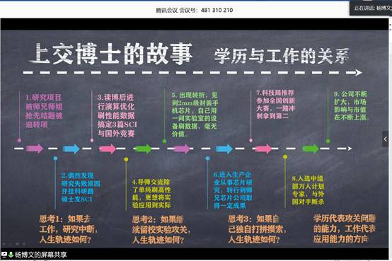 杨书记结合一位博士的故事,为大家剖析了学历与工作的关系。他提到,学历代表攻关问题的能力,工作则代表应用能力的方向。
