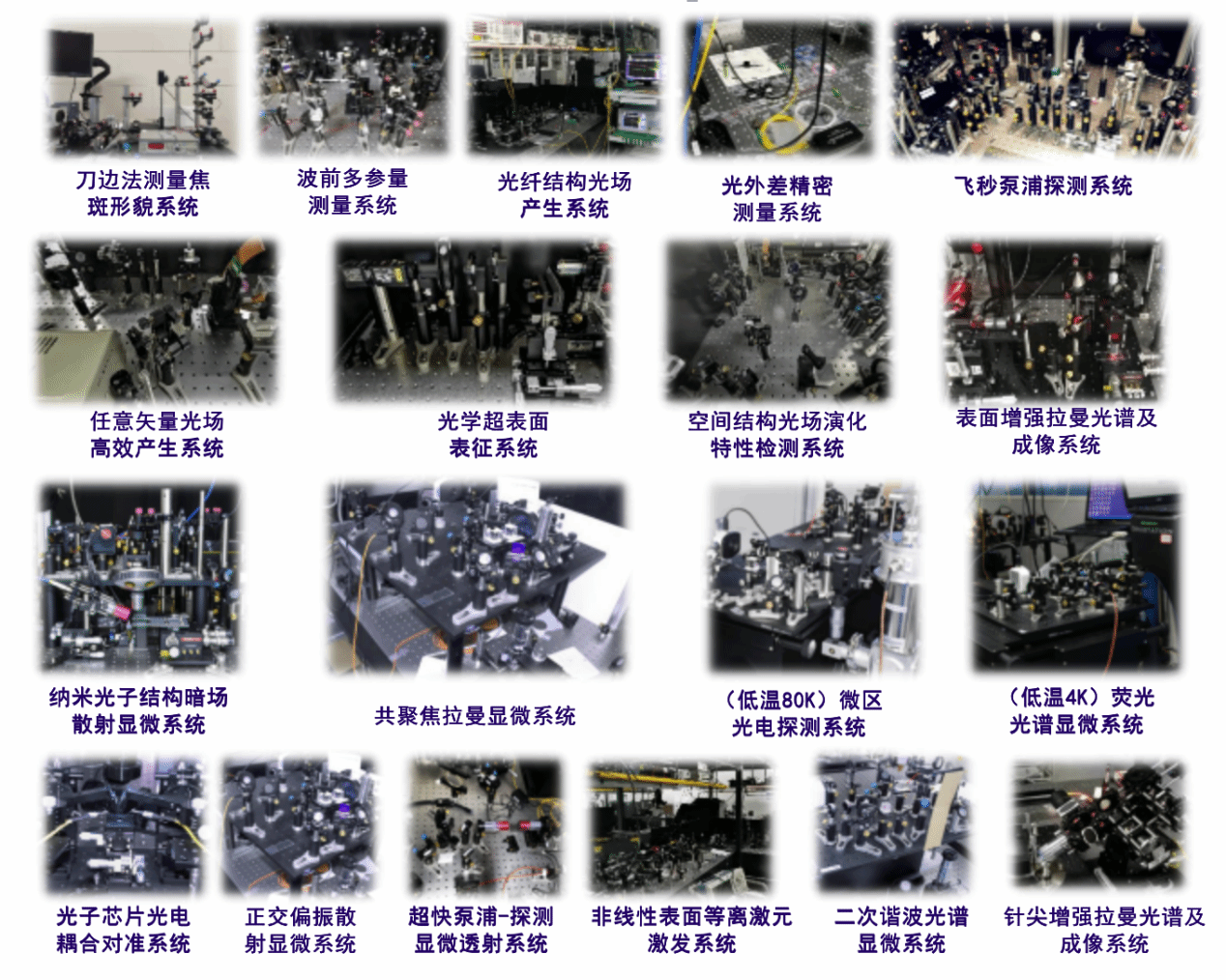 实验室拥有3000余平方米工作空间,包括光学超净室、光学样品化学处理室、光学仪器设备研制和装配室、微纳光子元器件的加工制备室、微纳光子元器件形貌和结构表征室等不同功能实验室。实验室现有固定资产总值近3000万元,包括不同类型激光器20余台套、光场多参量探测器和分析仪30余台套,加工和制备光纤、液晶、微纳光子元器件的仪器设备及特种环境试验设备等。同时还自主搭建了20余套实验仪器和系统平台。在光场调控与信息感知方面形成了国内一流的实验条件,可有效保证相关方向科学研究和人才培养工作的高质量开展。